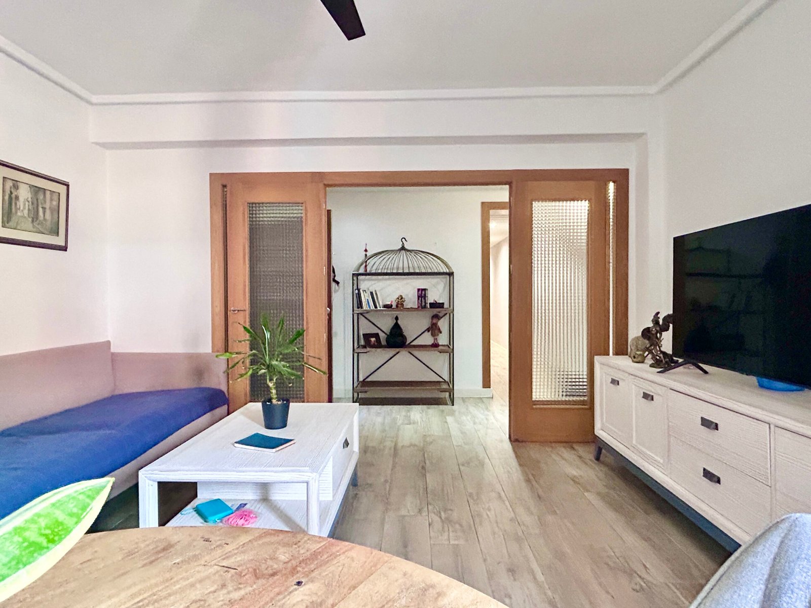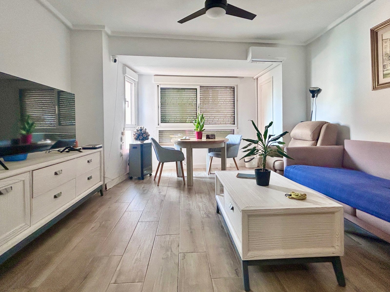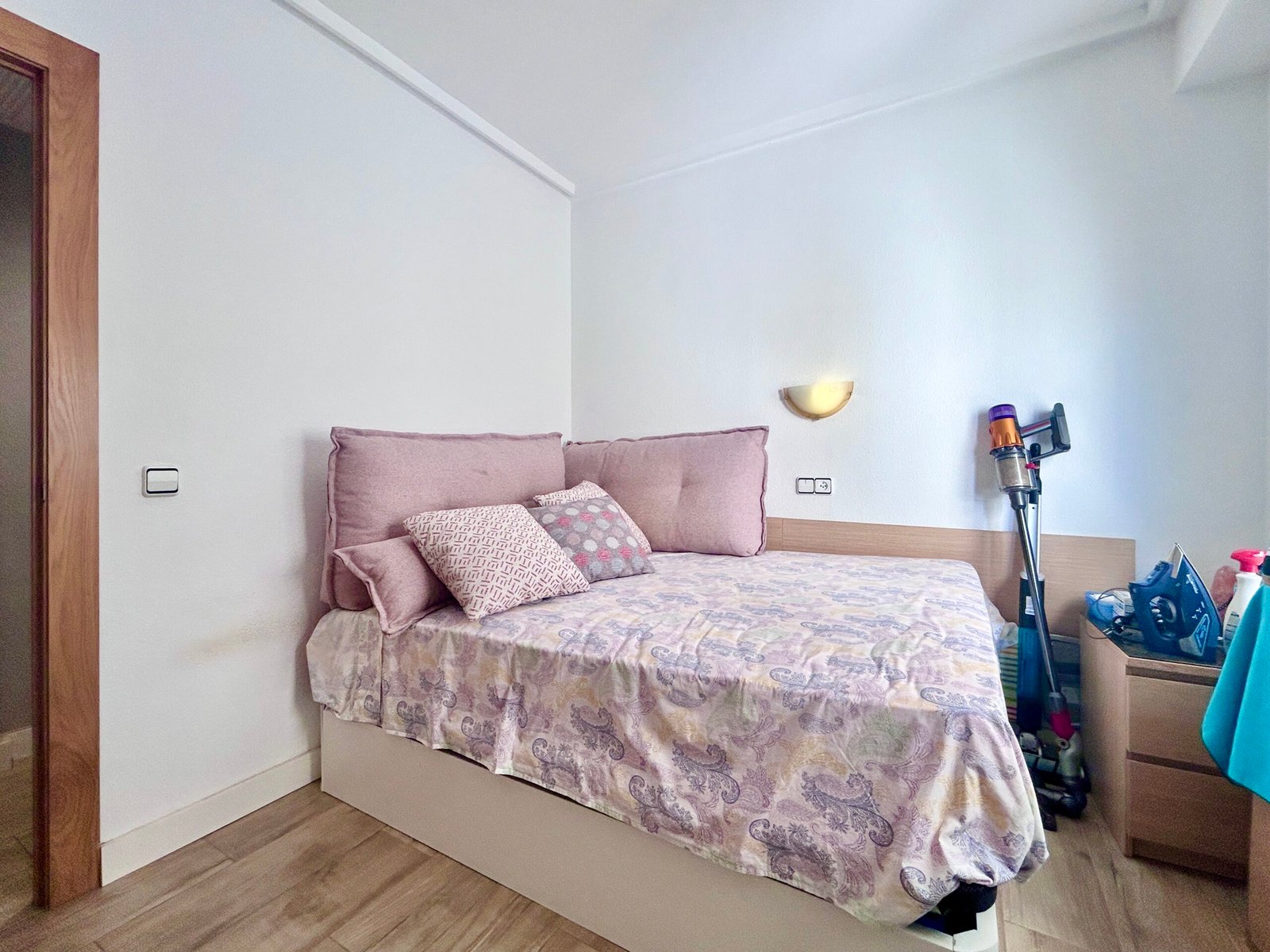 Se trata de una 5ª altura. Cuenta con rampa en el portal y ascensor. La vivienda está reformada con altas calidades: tarima C5 de muy buena calidad, cerramientos de Tekhnal, paredes lisas y aire acondicionado en salón y dormitorio. Son unos 80m2 útiles distribuidos de la siguiente manera.